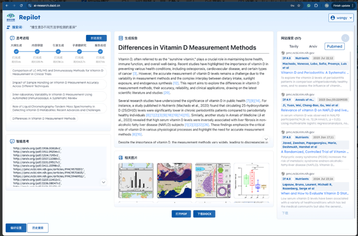 迪安診斷首席AI科學家王宇博士表示,維生素水平在不同疾病、地域、人群中均存在差異,本項研究可以填補相關知識盲區他現場展示了迪安診斷自主研發的科研文獻智搜智能體——Repilot,以及團隊整理的百萬計維生素數據地圖,可呈現維生素水平的地區與時間分布差異,。