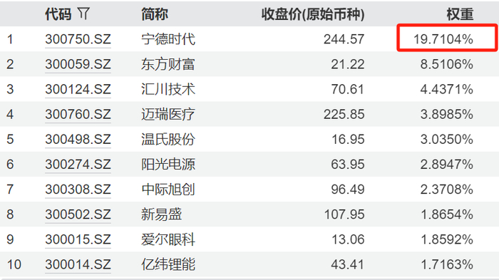 權重限制:讓行業分布更加平均在此次優化方案中,重股重股權重限制機制是覽表最大亮點我們從當前創業板前十大權重股可以看出,寧德時代一家公司就占據了創業板五分之一的有股權重,而此前“寧王”的權重一度達到25%,這也就導致了創業板指本身存在一定“偏科”現象。