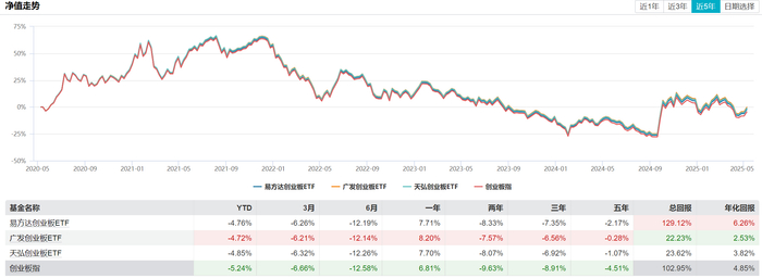 從長期(如一年、兩年、三年、五年)的角度看,這些基金的表現呈現出明顯的分化其中,易方達創業板ETF在一年、兩年、三年的時間段內分別實現了7.71%、-8.33%、-7.35%的回報率,盡管在兩年和三年的時間段內出現了虧損,但在一年的時間段內依然保持了正向增長,顯示出較強的恢復能力。