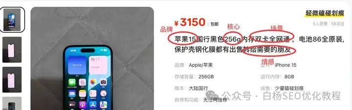 同時,發布標題可以用:品牌詞+核心詞+屬性詞+場景詞+情感詞:蘋果(品牌)15(核心)國行黑色(屬性)256g內存(核心)雙卡全網通(場景) ,電池86全原裝,保護殼鋼化膜都有出售轉給需要的朋友(情感),如圖: