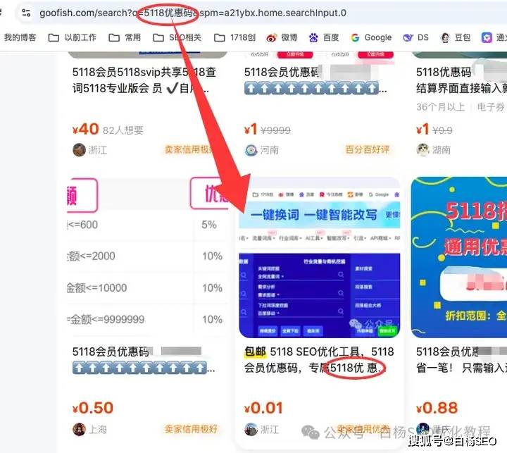 三、閑魚排名規則影響因素有哪些?閑魚SEO怎么做?1、閑魚的搜索排名規則影響因素到底有哪些?1)關鍵詞匹配度關鍵詞匹配度越高,同等條件排名越靠前,決定搜索流量80%展現度!這是做閑魚搜索流量的基礎!舉例,比如我做的5118優惠碼,排在網頁版搜索第10,如圖: